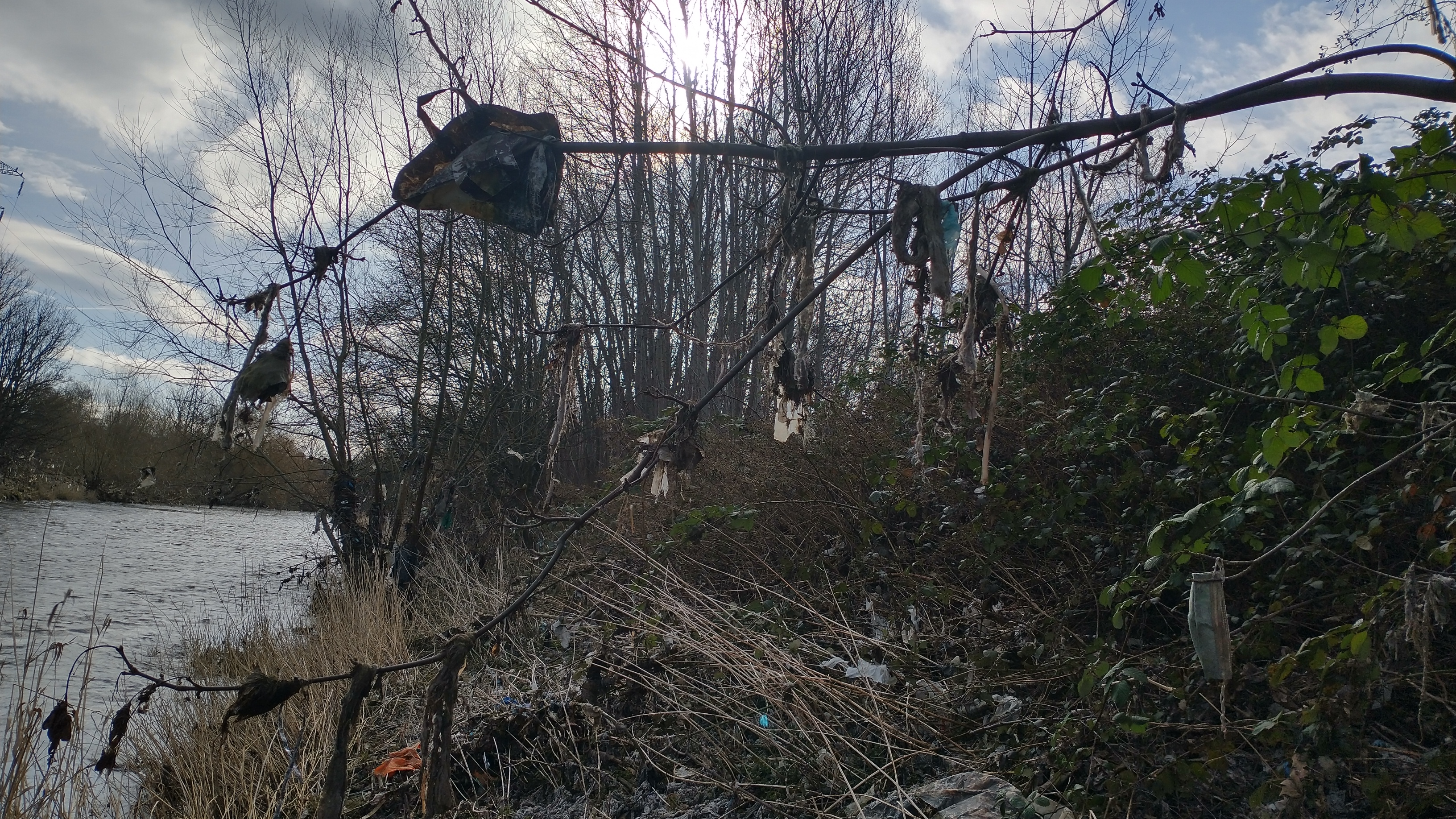 After my cuppa I moved the paternostered trout into the slack caused by the over hanging tree. The ledgered roach was tossed out to a far bank feature. I didn't have long to wait before the dropback clunked onto the bankstick. This felt a lot bigger than the first fish and moved steadily upstream hugging the far bank. A bit more pressure and it gave up and came in like a dead weight. As it got closer to me I tried lifting it off the bottom which seemed to wake it up. It plummeted to the river bed causing a huge cloud of bubbles to rise. Everything went very heavy again. A good heave created even more bubbles. I was snagged again. Bigger and heavier then the previous branch I eventually got the seven foot monster to the surface sans fish. A bit more heave and it was on the bank.